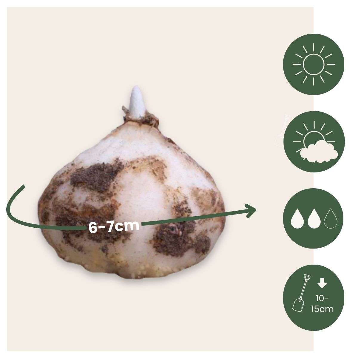 De bloembollen hebben een omtrek van ongeveer 6/7cm bij levering.