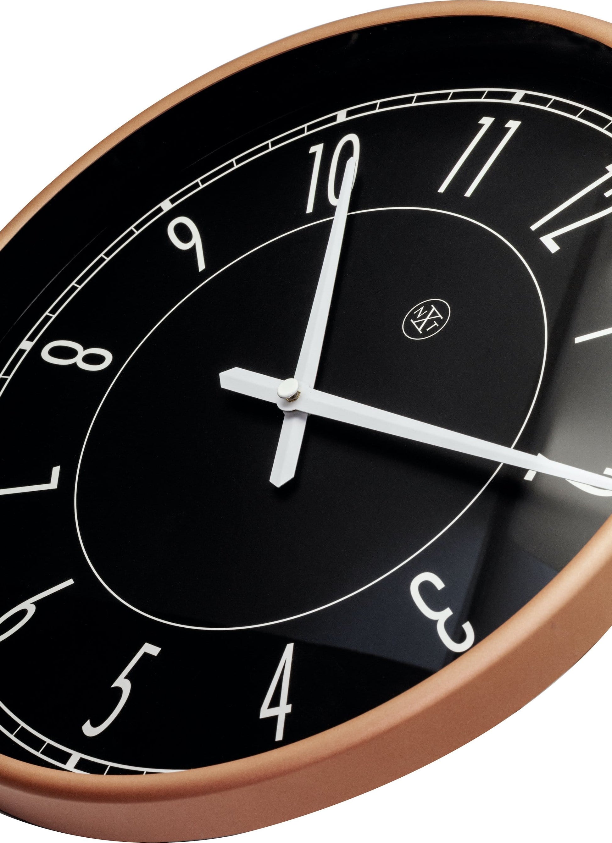 The nXt "Jason" is a round black plastic wall clock (¯ 30 cm). The matte rosŽ case gives this clock a trendy touch and the clear hour indication with Arabic numbers makes it easy to read the time. It runs on 1x AA battery (not included).