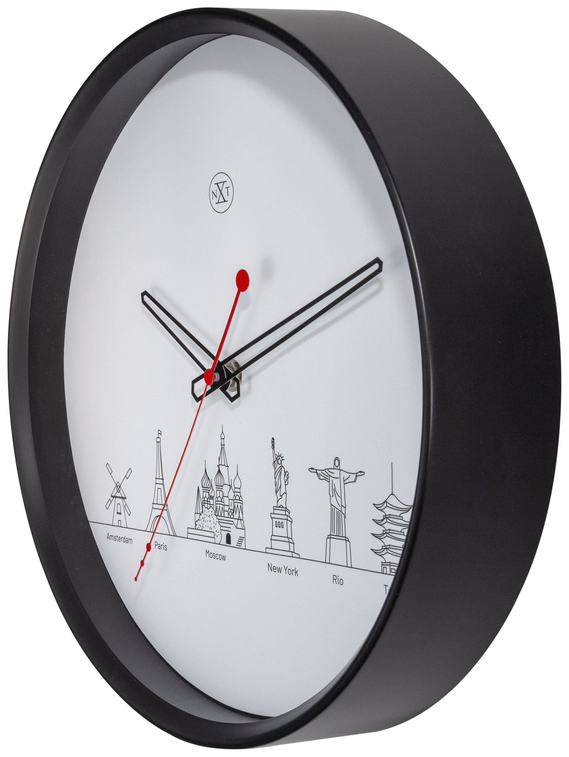 The nXt "Worldtour" is a modern round wall clock (Ø30cm). The plastic clock has a black case and a white dial with important highlights from different cities in the world. The clock has a modern look because of the open hands and beautiful red second hand. This clock is silent and works on 1 AA battery (not included).
