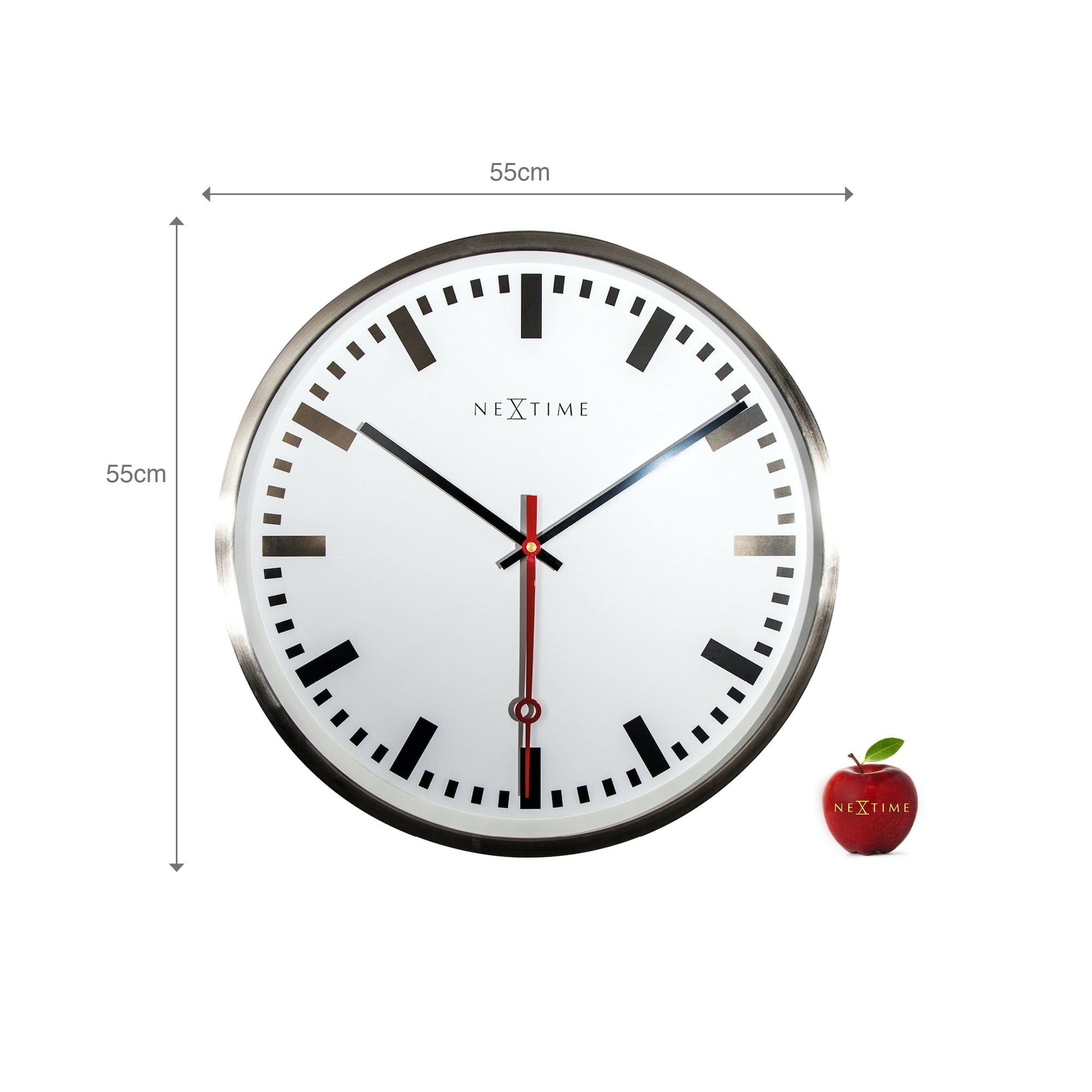 The NeXtime "Super Station" is a large wall clock made of an aluminium case with a brushed finish and a white dial. The hour indication is marked with black stripes. The large red second hand makes this clock unique. The large size of this clock makes it a real eye-catcher. It runs on 1 AA battery (not included).